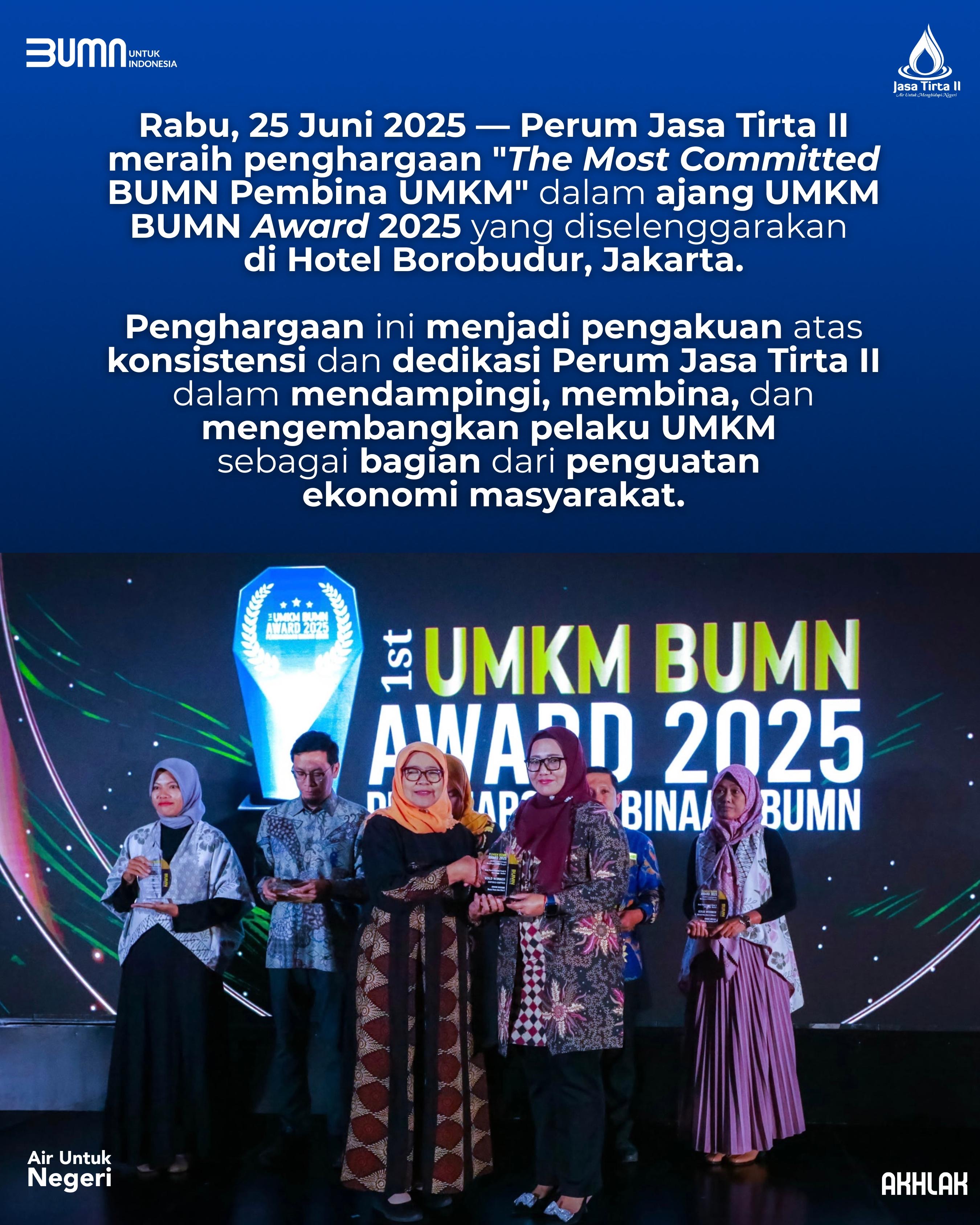Rabu, 25 Juni 2025 — Perum Jasa Tirta II meraih penghargaan "The Most Committed BUMN Pembina UMKM" dalam ajang UMKM BUMN Award 2025 yang diselenggarakan di Hotel Borobudur, Jakarta.