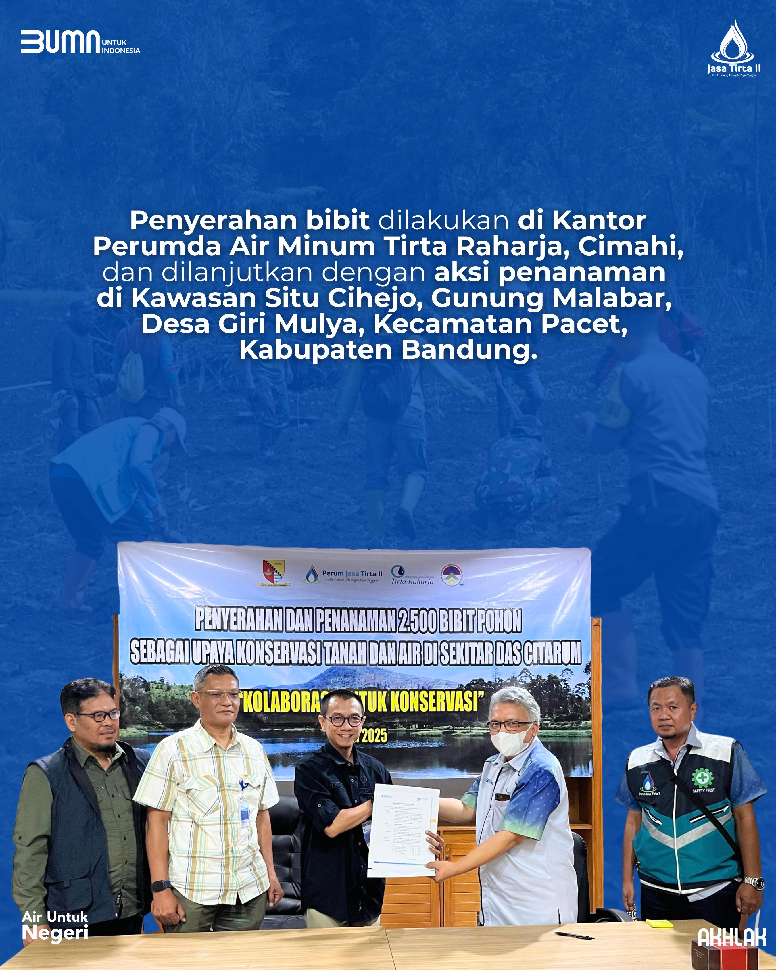 Sebagai bentuk nyata komitmen pelestarian lingkungan, Perum Jasa Tirta II menyerahkan dan menanam 2.500 bibit pohon dalam rangka konservasi tanah dan air di kawasan DAS Citarum.