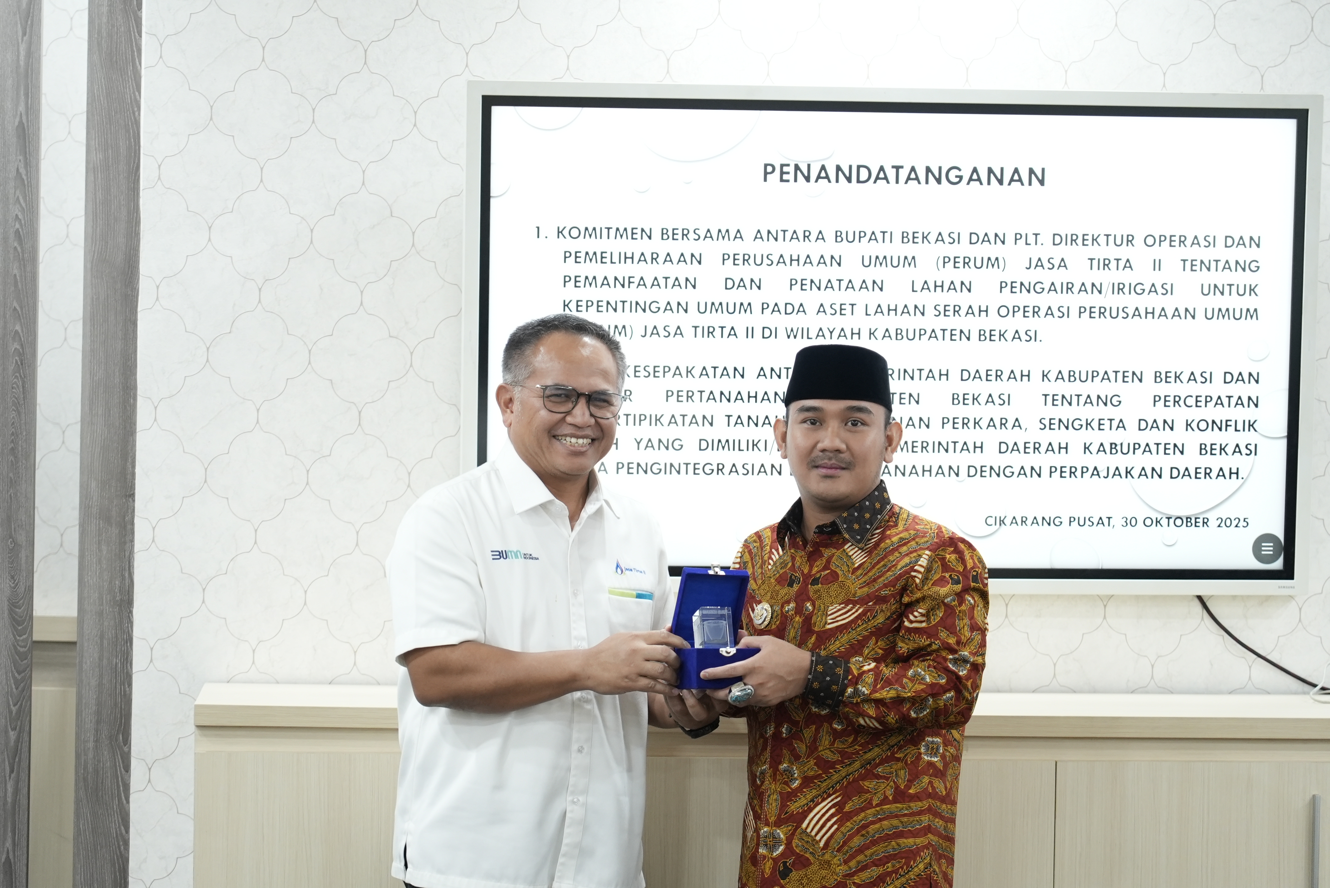 Kamis, 30 Oktober 2025, Bertempat di Kabupaten Bekasi, telah dilaksanakan Penandatanganan Komitmen Bersama antara Bupati Bekasi dan Plt. Direktur Operasi dan Pemeliharaan Perum Jasa Tirta II mengenai Pemanfaatan dan Penataan Lahan Pengairan/Irigasi untuk Kepentingan Umum pada Aset Lahan Serah Operasi Perum Jasa Tirta II di Wilayah Kabupaten Bekasi. Melalui komitmen ini, kedua pihak bersepakat untuk bersinergi dalam berbagai bidang, di antaranya: Pemanfaatan dan penataan lahan Barang Milik Negara yang diserahoperasikan kepada PJT II di wilayah Kabupaten Bekasi, Pengembangan Ruang Terbuka Hijau, Normalisasi sungai dan/atau saluran di wilayah Kabupaten Bekasi dalam rangka pengendalian banjir, Penyediaan bantuan alat berat, Pengendalian pencemaran sampah pada sungai/saluran di wilayah Kabupaten Bekasi dan Penertiban bangunan liar di sempadan sumber air, serta Koordinasi lintas instansi guna mendukung pengelolaan sumber daya air yang berkelanjutan. Kerja sama ini menjadi langkah nyata sinergi antara Pemerintah Daerah dan Perum Jasa Tirta II dalam menjaga, menata, dan memanfaatkan sumber daya air serta lahan irigasi untuk kemaslahatan masyarakat Kabupaten Bekasi.
