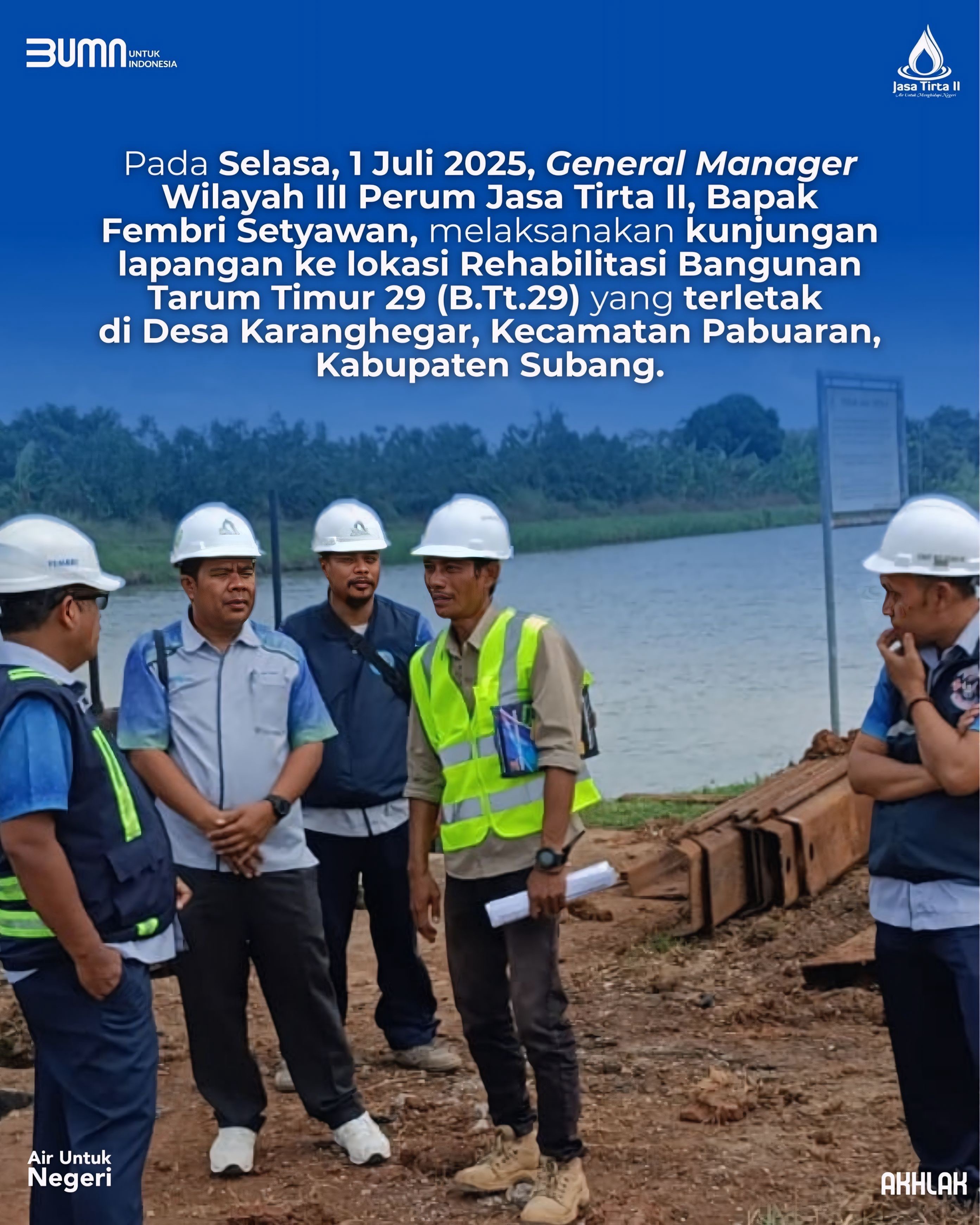 Pada Selasa, 1 Juli 2025, General Manager Wilayah III Perum Jasa Tirta II, Bapak Fembri Setyawan, melaksanakan kunjungan lapangan ke lokasi Rehabilitasi Bangunan Tarum Timur 29 (B.Tt.29) yang terletak di Desa Karanghegar, Kecamatan Pabuaran, Kabupaten Subang.