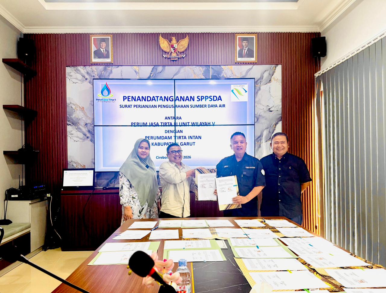Pada hari Kamis, 9 April 2026, telah dilaksanakan kegiatan Penandatanganan Surat Perjanjian Pengusahaan Sumber Daya Air (SPPSDA) antara Perum Jasa Tirta II dengan Perumdam Tirta Intan Kabupaten Garut yang bertempat di Kantor Unit Wilayah V Cirebon. Penandatanganan dilakukan langsung oleh General Manager Wilayah V, Bapak Cucu Harnanto, ST., MM bersama Direktur Utama Perumdam Tirta Intan Kabupaten Garut, Bapak Dr. H. Dadan Hidayatulloh, M.I.Pol. Kegiatan ini turut dihadiri oleh Direktur Teknik, Sekretaris Perusahaan, serta jajaran dari Perumdam Tirta Intan Kabupaten Garut, dan Manager Administrasi & Usaha Wilayah V beserta jajaran. Kegiatan ini merupakan wujud implementasi penerapan BJPSDA dalam rangka pelaksanaan Pengelolaan Sumber Daya Air di Wilayah Sungai Cimanuk Cisanggarung oleh Perum Jasa Tirta II Unit Wilayah V.