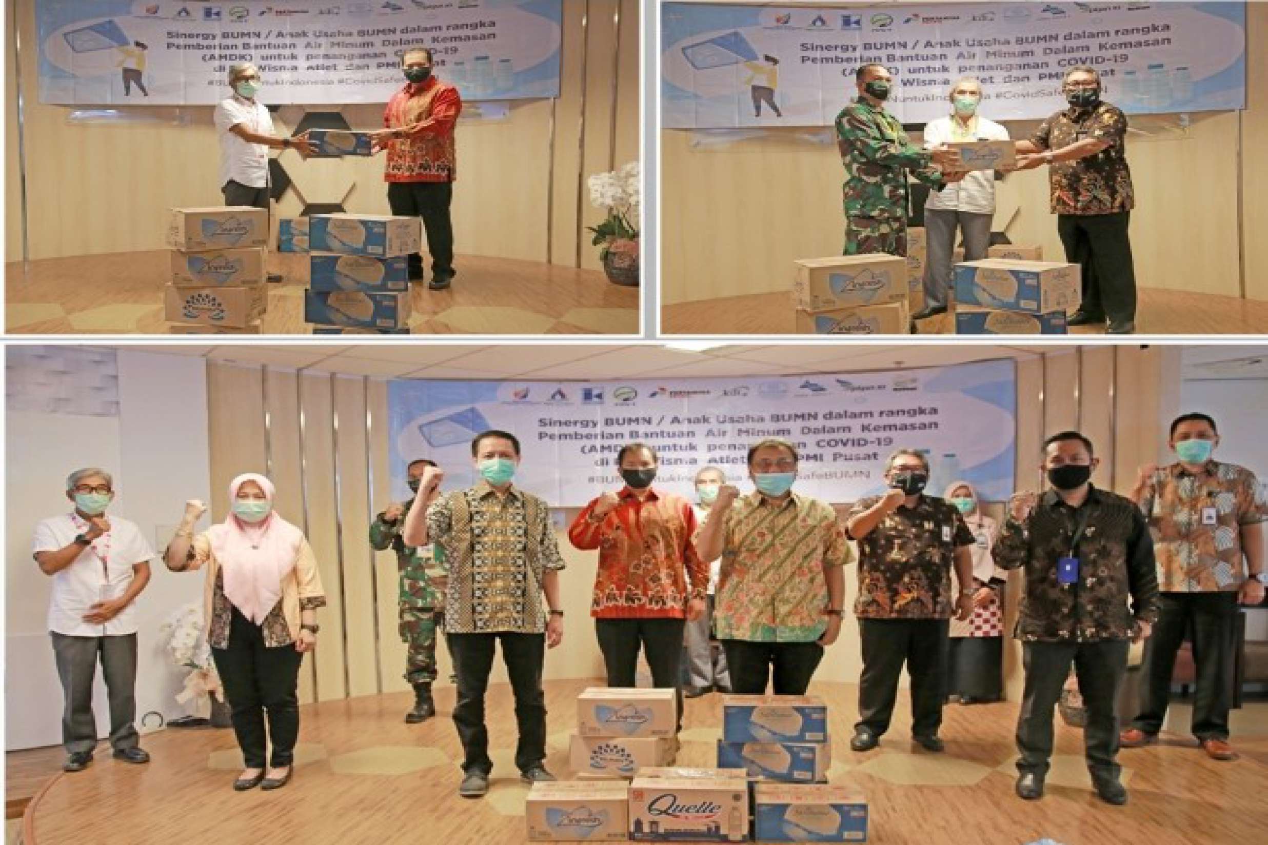 Melalui PT. JIEP selaku Koordinator Satuan Tugas BUMN, sebanyak 86.400 botol dan 18.000 cup disalurkan ke RS Wisma Atlet, RS Persahabatan, RS Pertamina Jakarta, RS Gatot Subroto dan RS Pelni. Sisanya sebanyak 21.600 botol dan 4.000 cup diberikan kepada Palang merah Indonesia.