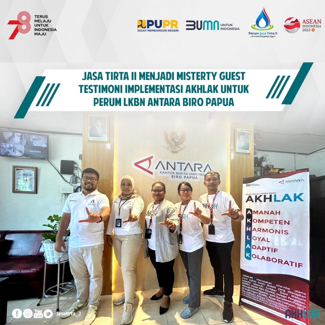 Perum Jasa Tirta II yang diwakili oleh manajer POHI menjadi Mistery Guest dalam kegiatan Testimoni Implementasi AKHLAK sebagai Salah Satu Rangkaian Kegiatan 3 Tahun AKHLAK BUMN di Perum LKBN Antara Biro Papua dilaksanakan di Kantor Biro Papua pada tanggal 30 Agustus 2023.