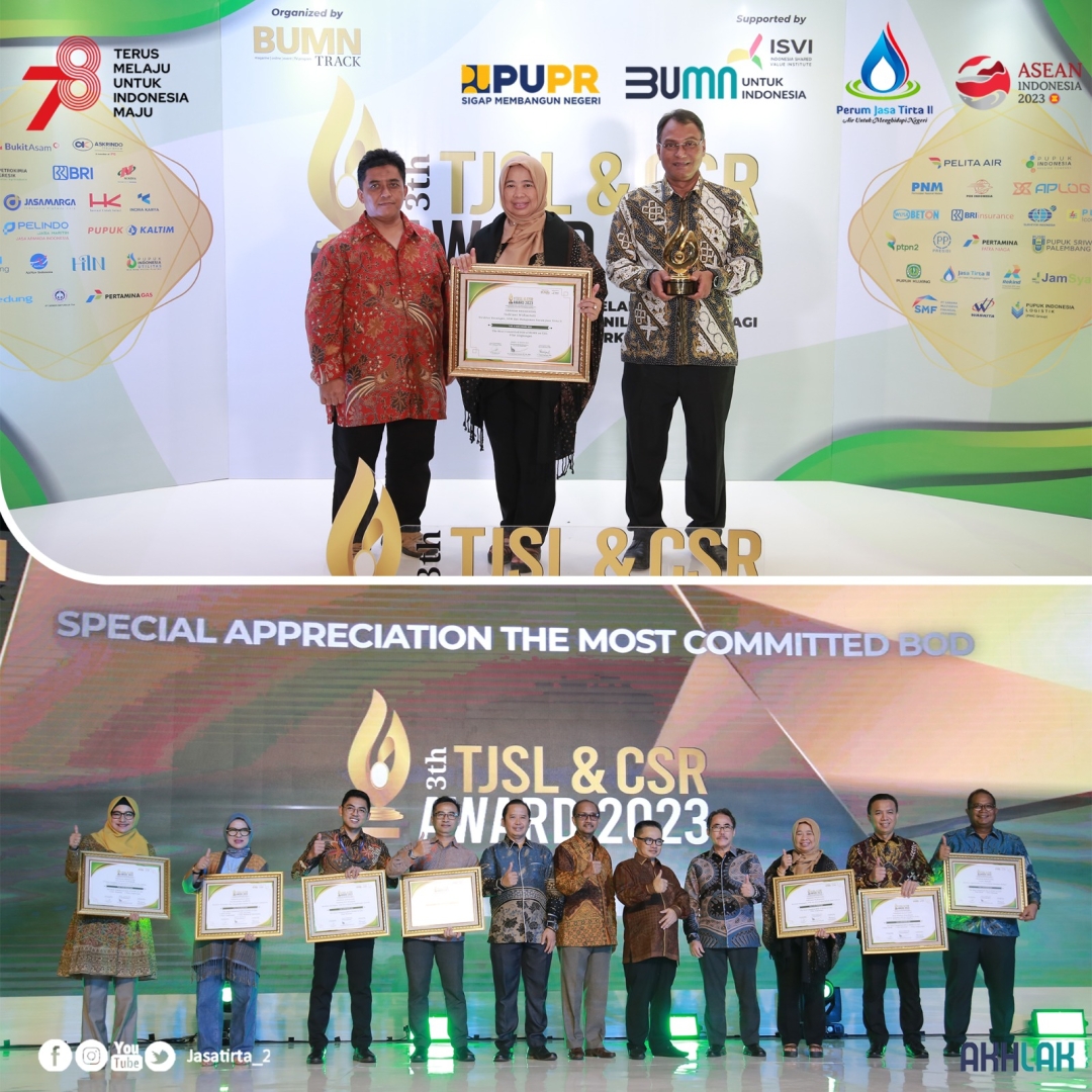 Jasa Tirta II kembali meraih penghargaan TJSL & CSR Award Tahun 2023 Pilar Lingkungan kategori Platinum karena berhasil menerapkan Program Pengolahan Limbah Eceng Gondok di Waduk Jatiluhur untuk kelestarian lingkungan dan mendukung bisnis perusahaan.