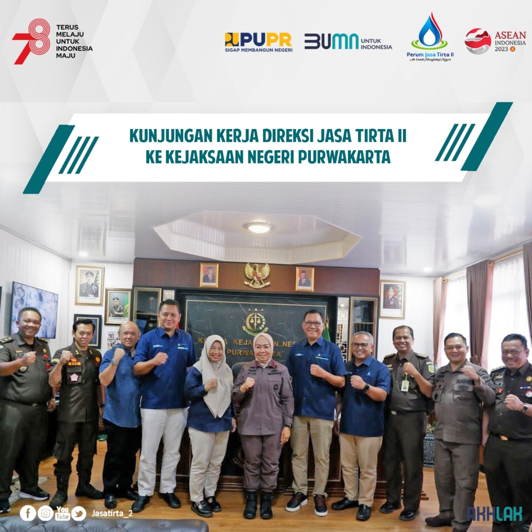Direktur Utama Jasa Tirta II Imam Santoso beserta dengan Direktur Keuangan, SDM & Manajemen Resiko Indiani Widiastuti, Direktur Operasi & Pemeliharaan Anton Mardiyono dan Direktur Pengembangan Usaha Dikdik Permadi Yoffana melakukan kunjungan kerja ke Kejaksaan Negeri Purwakarta pada Kamis, 10 Agustus 2023