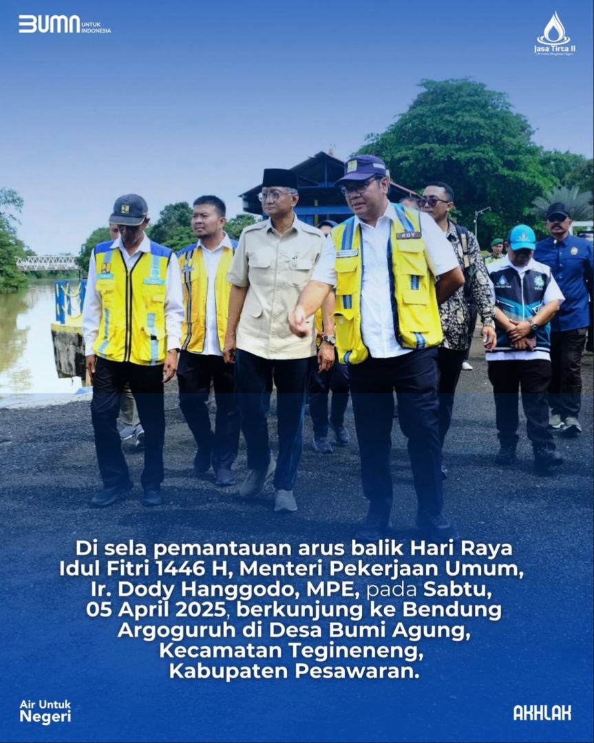 Di sela pemantauan arus balik Hari Raya Idul Fitri 1446 H, Menteri Pekerjaan Umum, Ir. Dody Hanggodo, MPE, pada Sabtu, 05 April 2025, berkunjung ke Bendung Argoguruh di Desa Bumi Agung, Kecamatan Tegineneng, Kabupaten Pesawaran.