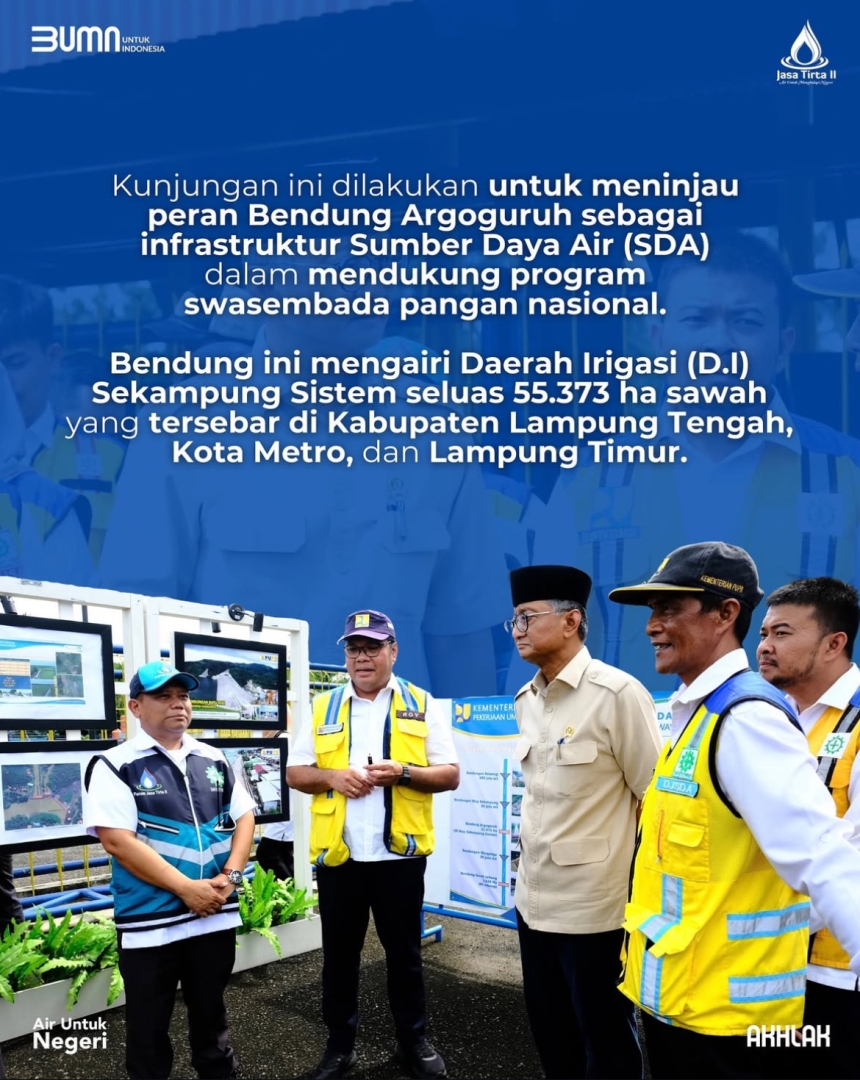 Kunjungan ini dilakukan untuk meninjau peran Bendung Argoguruh sebagai infrastruktur Sumber Daya Air (SDA) dalam mendukung program swasembada pangan nasional. Bendung ini mengairi Daerah Irigasi (D.I) Sekampung Sistem seluas 55.373 ha sawah yang tersebar di Kabupaten Lampung Tengah, Kota Metro, dan Lampung Timur.