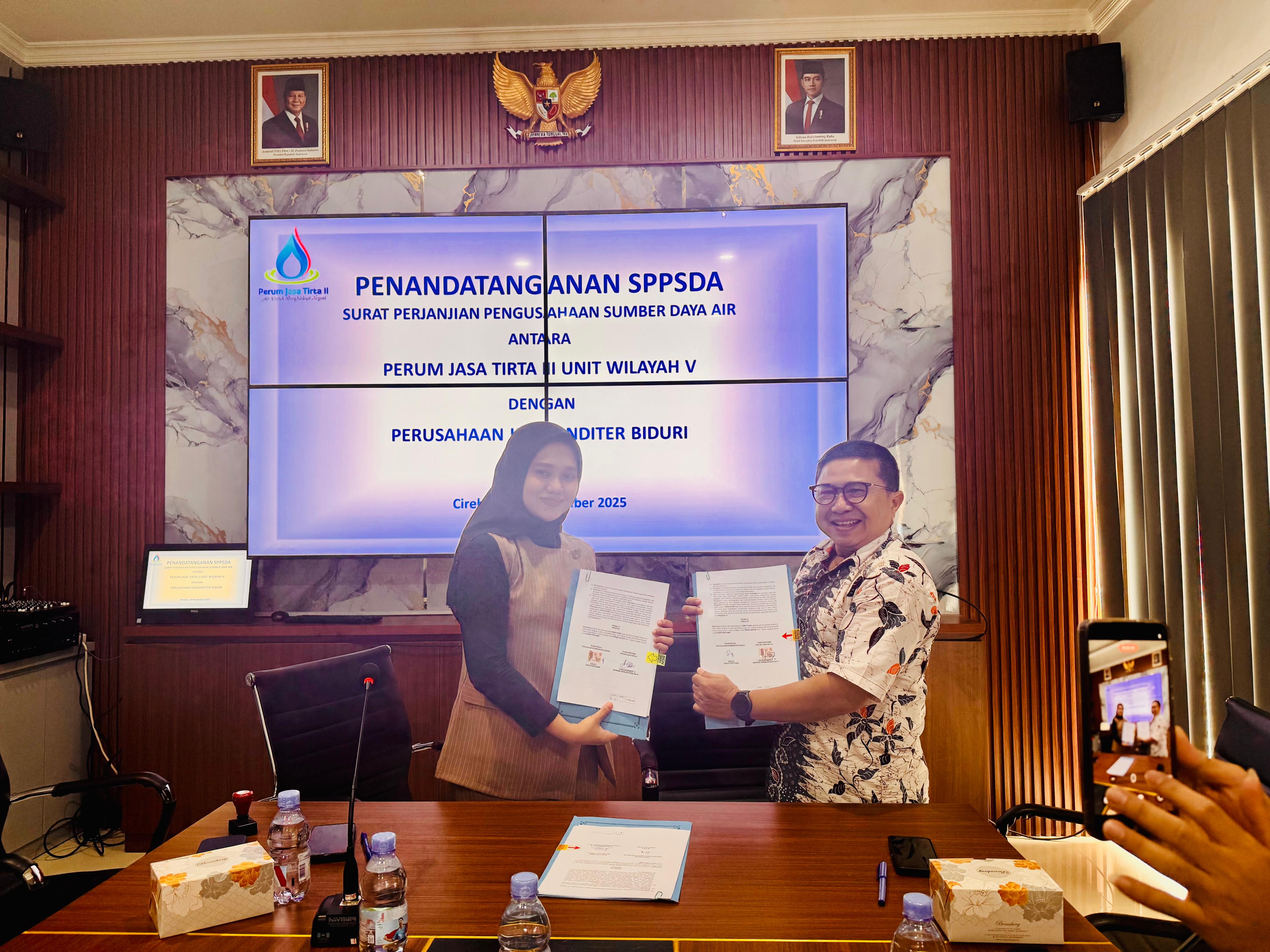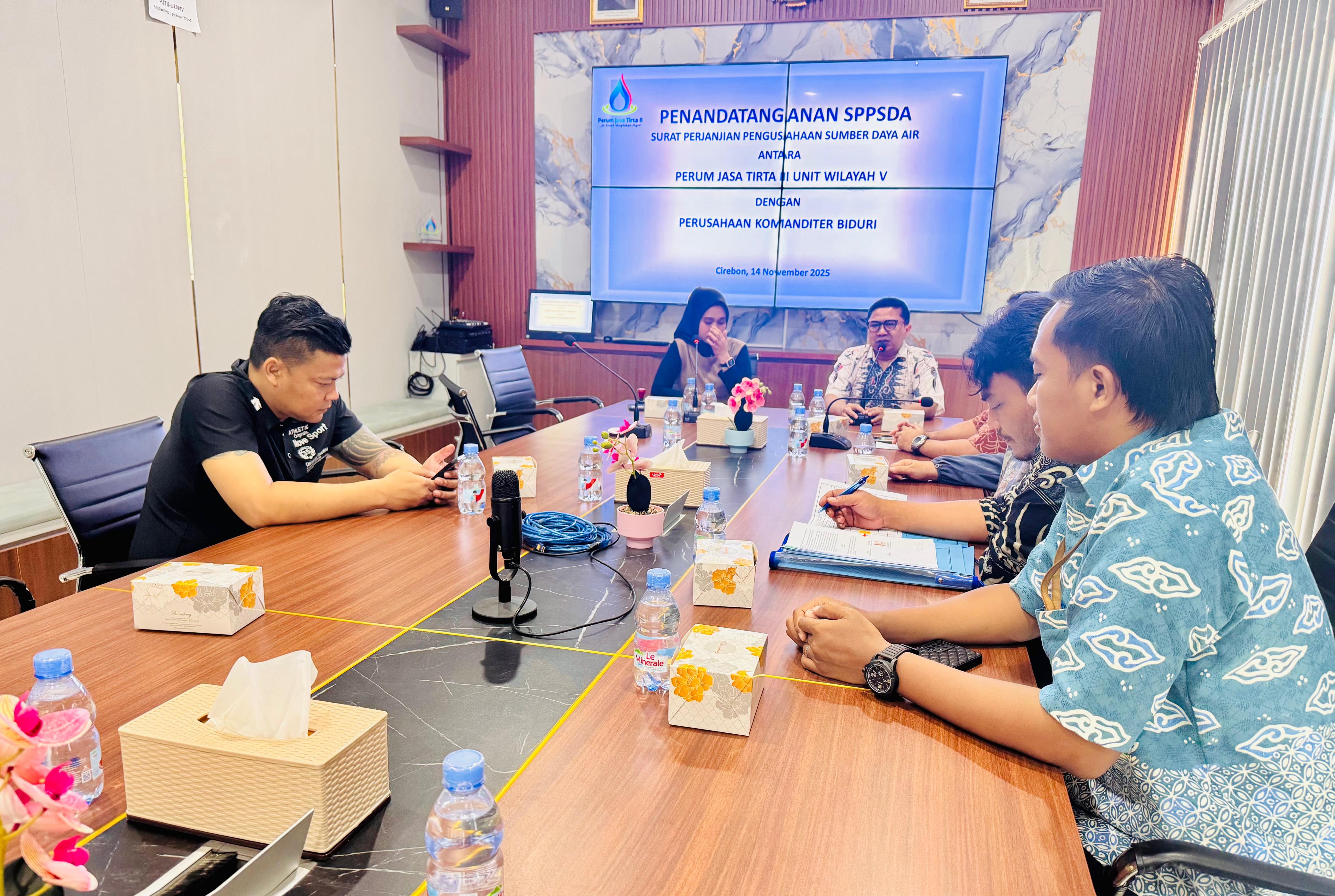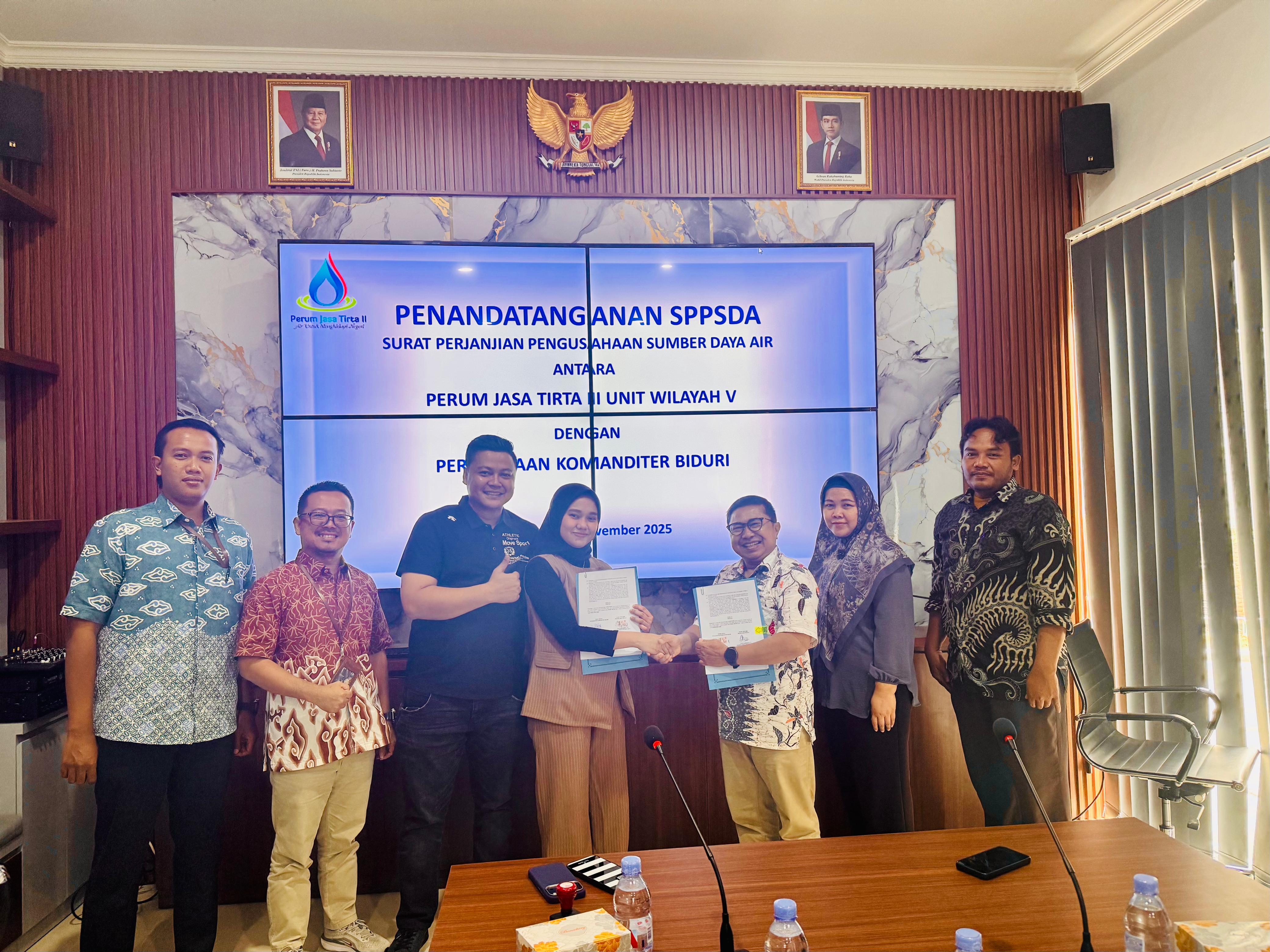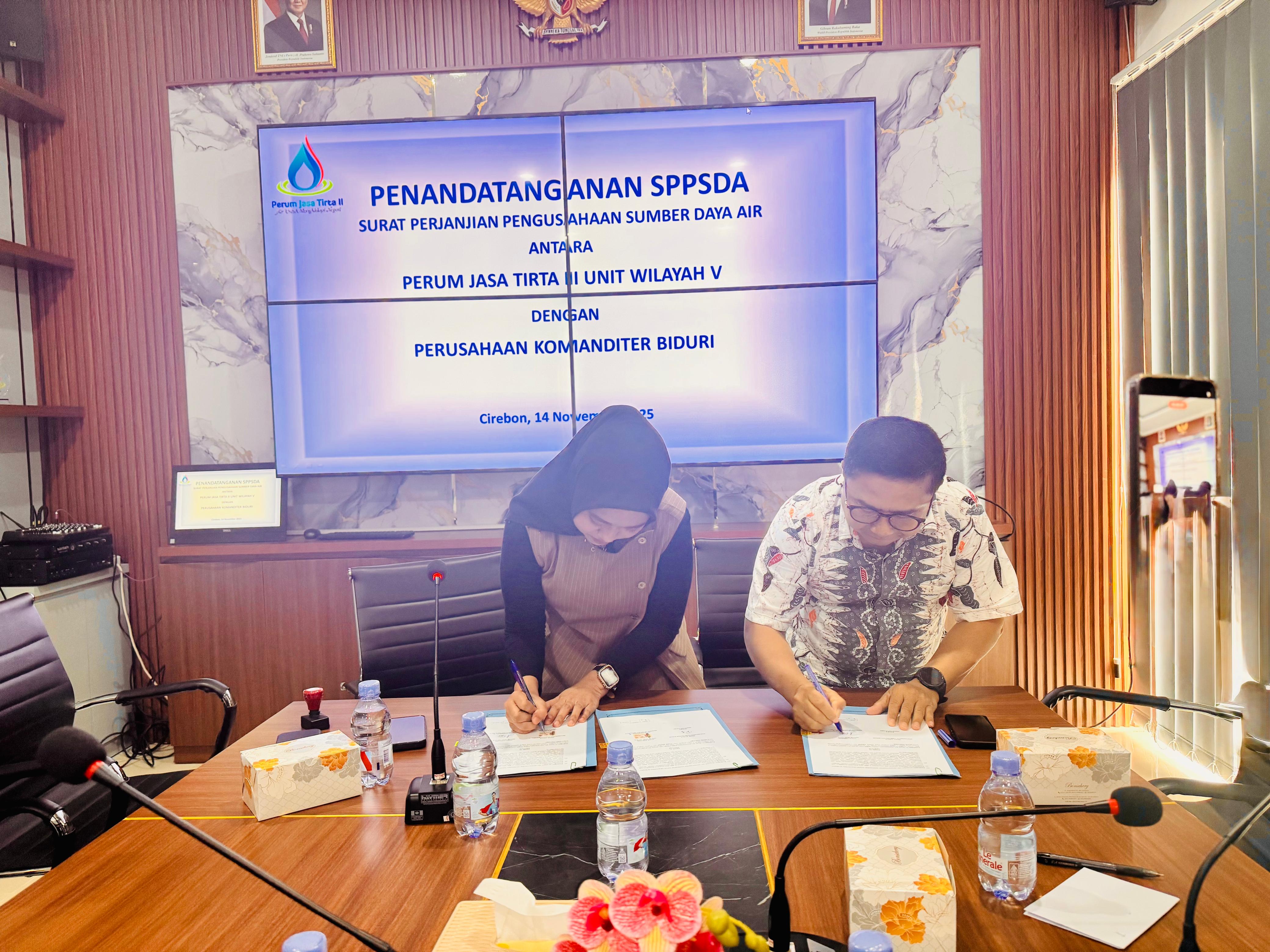 Pada Jumat, 14 November 2025, telah dilaksanakan Penandatanganan Surat Perjanjian Pengusahaan Sumber Daya Air (SPPSDA) antara Perum Jasa Tirta II Unit Wilayah V dan Perusahaan Komanditer Biduri Kabupaten Garut, bertempat di Kantor Unit Wilayah V Cirebon. Penandatanganan dilakukan oleh General Manager Unit Wilayah V Perum Jasa Tirta II, Bapak Cucu Harnanto, dan Direktur Utama Perusahaan Komanditer Biduri, Ibu Rosy, serta disaksikan oleh jajaran Unit Wilayah V PJT II dan Perusahaan Komanditer Biduri. Kegiatan ini merupakan wujud implementasi penerapan BJPSDA dalam rangka mendukung pengelolaan Sumber Daya Air di Wilayah Sungai Cimanuk Cisanggarung oleh Perum Jasa Tirta II Unit Wilayah V.