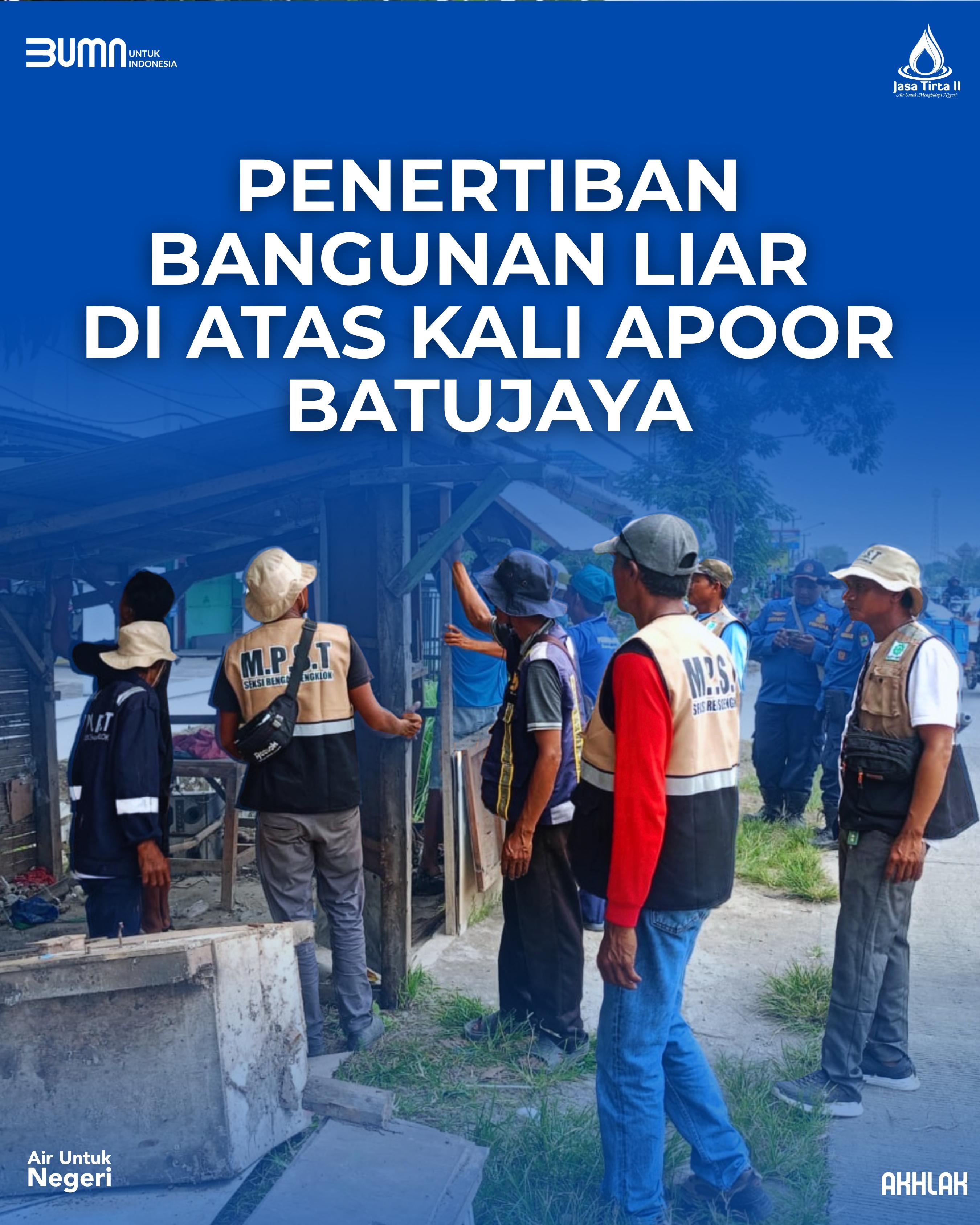 Pada Kamis, 10 Juli 2025, Perum Jasa Tirta II bersama Pemerintah Daerah Kabupaten Karawang melaksanakan kegiatan Pembongkaran 535 Bangunan Liar yang berdiri di atas Kali Apoor di wilayah Desa Teluk Bango, Desa Teluk Ambulu, dan Desa Batujaya, Kecamatan Batujaya, Kabupaten Karawang.