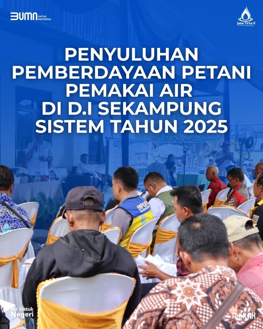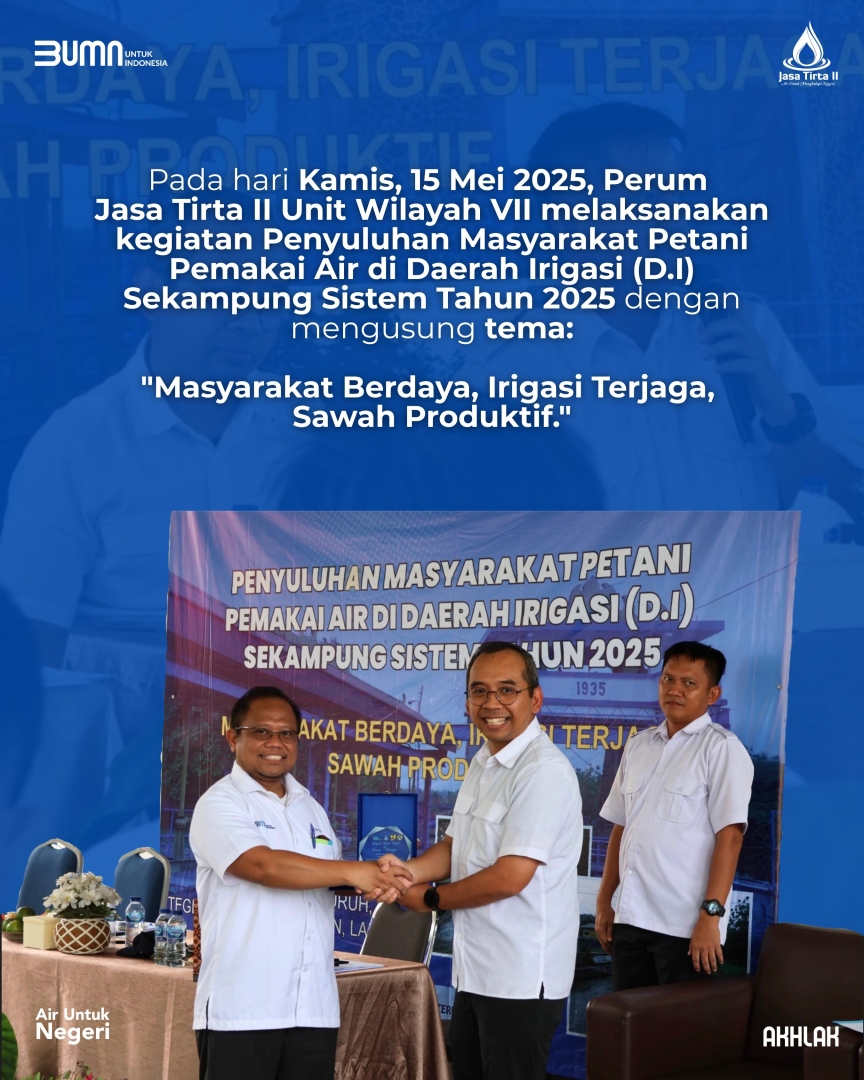 Pada hari Kamis, 15 Mei 2025, Perum Jasa Tirta II Unit Wilayah VII melaksanakan kegiatan Penyuluhan Masyarakat Petani Pemakai Air di Daerah Irigasi (D.I) Sekampung Sistem Tahun 2025 dengan mengusung tema: