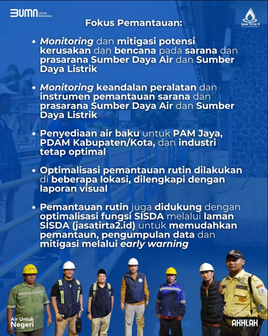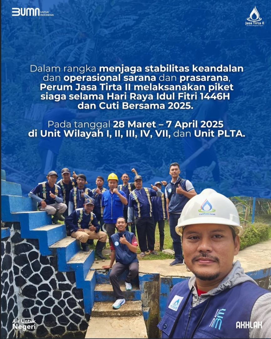 Dalam rangka menjaga stabilitas keandalan dan operasional sarana dan prasarana, Perum Jasa Tirta II melaksanakan piket pada Hari Raya Idul Fitri 1446H dan Cuti Bersama Tahun 2025.