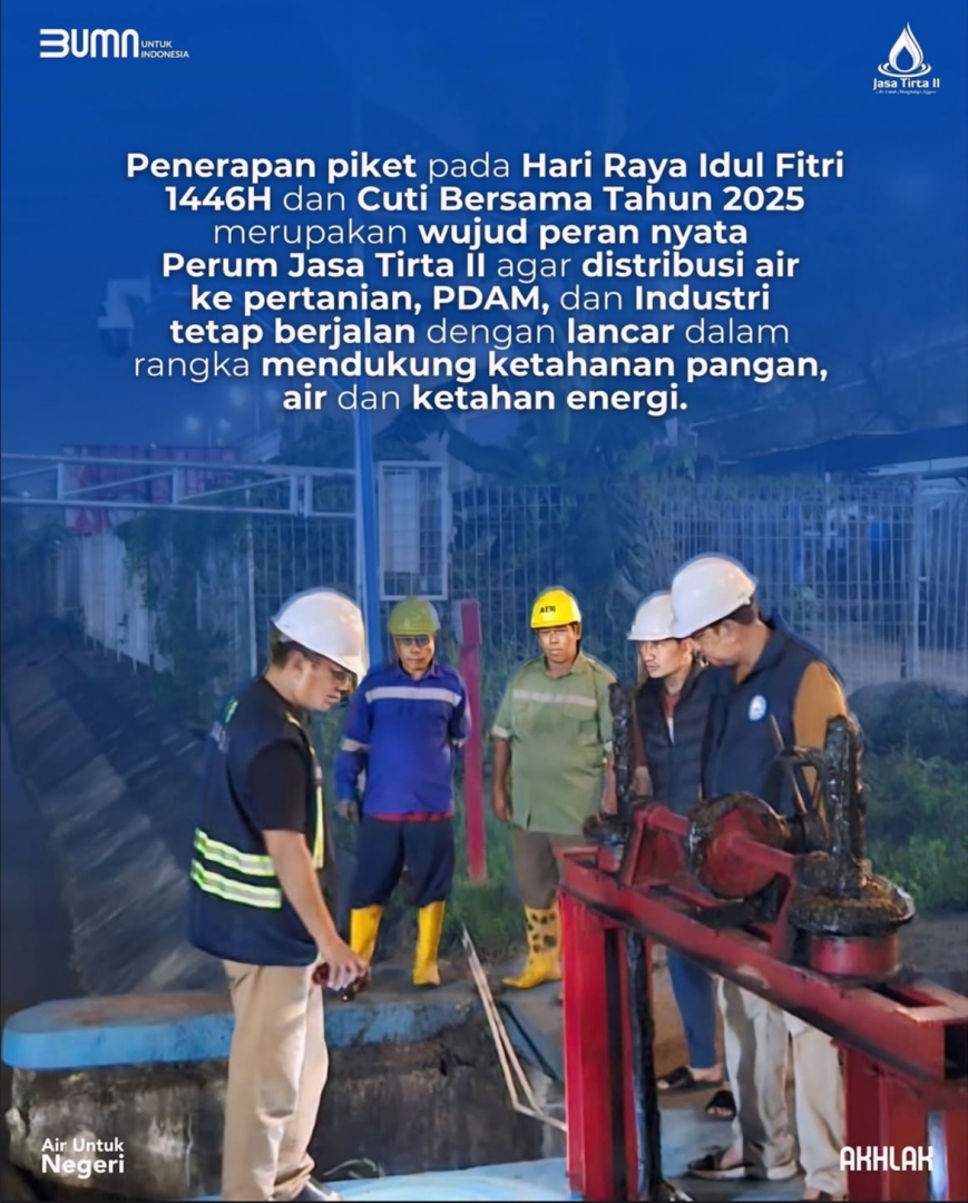 Penerapan piket pada Hari Raya Idul Fitri 1446H dan Cuti Bersama Tahun 2025 merupakan wujud peran nyata Perum Jasa Tirta II agar distribusi air ke pertanian, PDAM, dan Industri tetap berjalan dengan lancar dalam rangka mendukung ketahanan pangan, air dan ketahan energi.