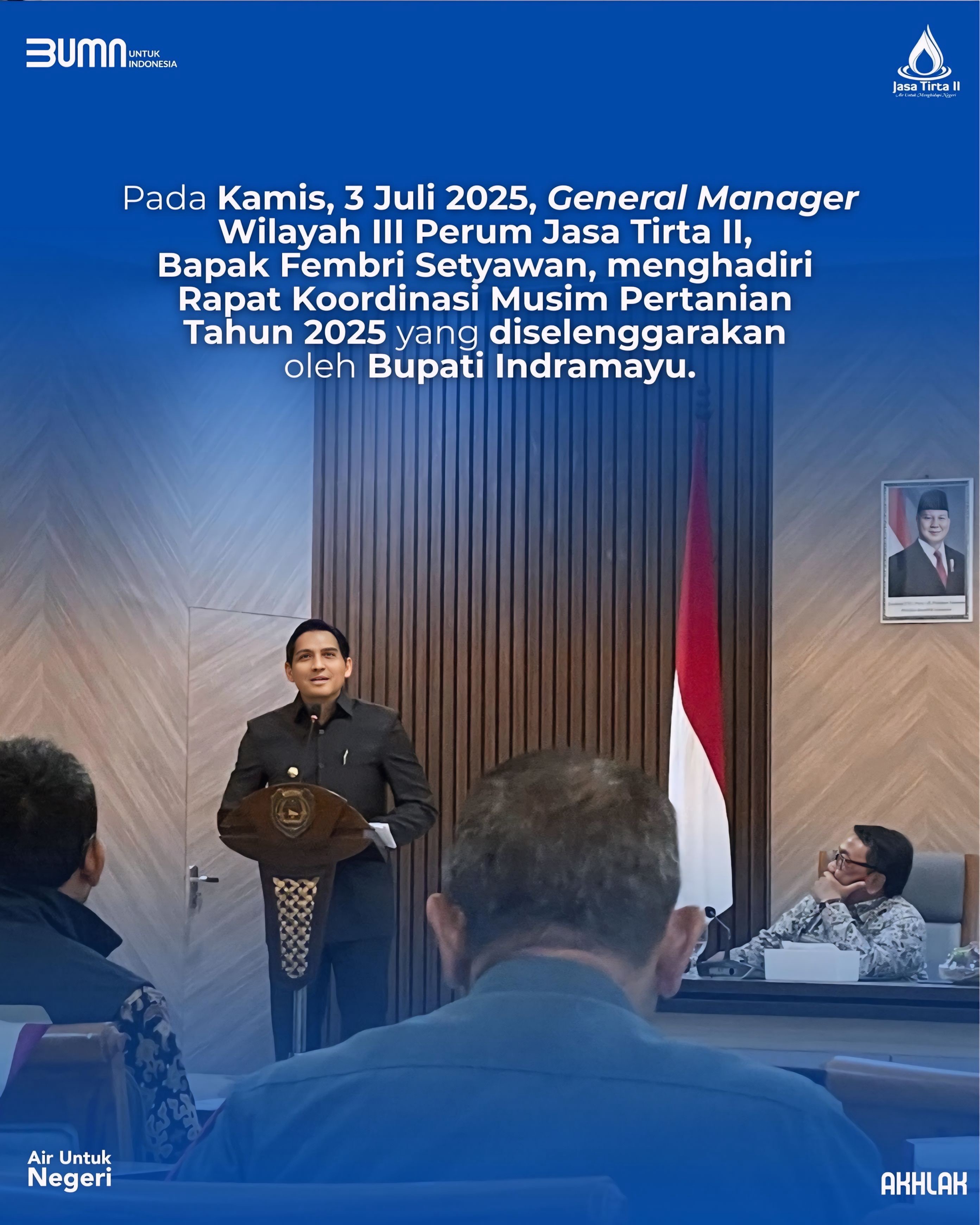 Pada Kamis, 3 Juli 2025, General Manager Wilayah III Perum Jasa Tirta II, Bapak Fembri Setyawan, menghadiri Rapat Koordinasi Musim Pertanian Tahun 2025 yang diselenggarakan oleh Bupati Indramayu.