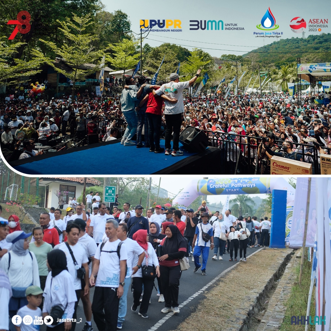PURWAKARTA - Jasa Tirta II menggelar Jalan Santai bertajuk "Grateful Pathway" yang diikuti sekitar 4000 masyarakat pada Senin, 29 Agustus 2023. Antusiasme peserta yang terdiri dari karyawan dan keluarga, purnabhakti dan masyarakat terlihat senang dan memadati rute jalan santai yang start dari Ghra Vidya dan finish di Jatiluhur Water World