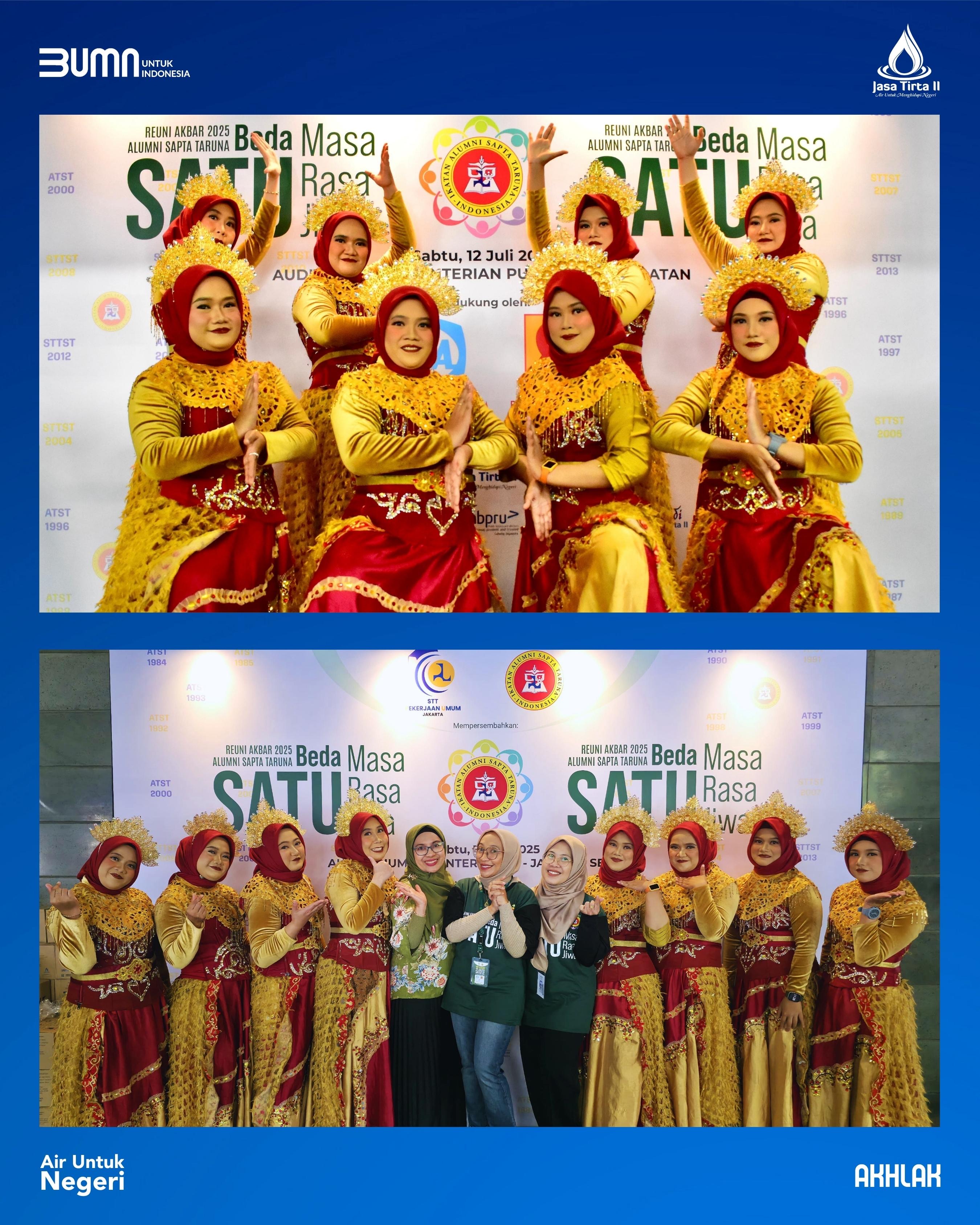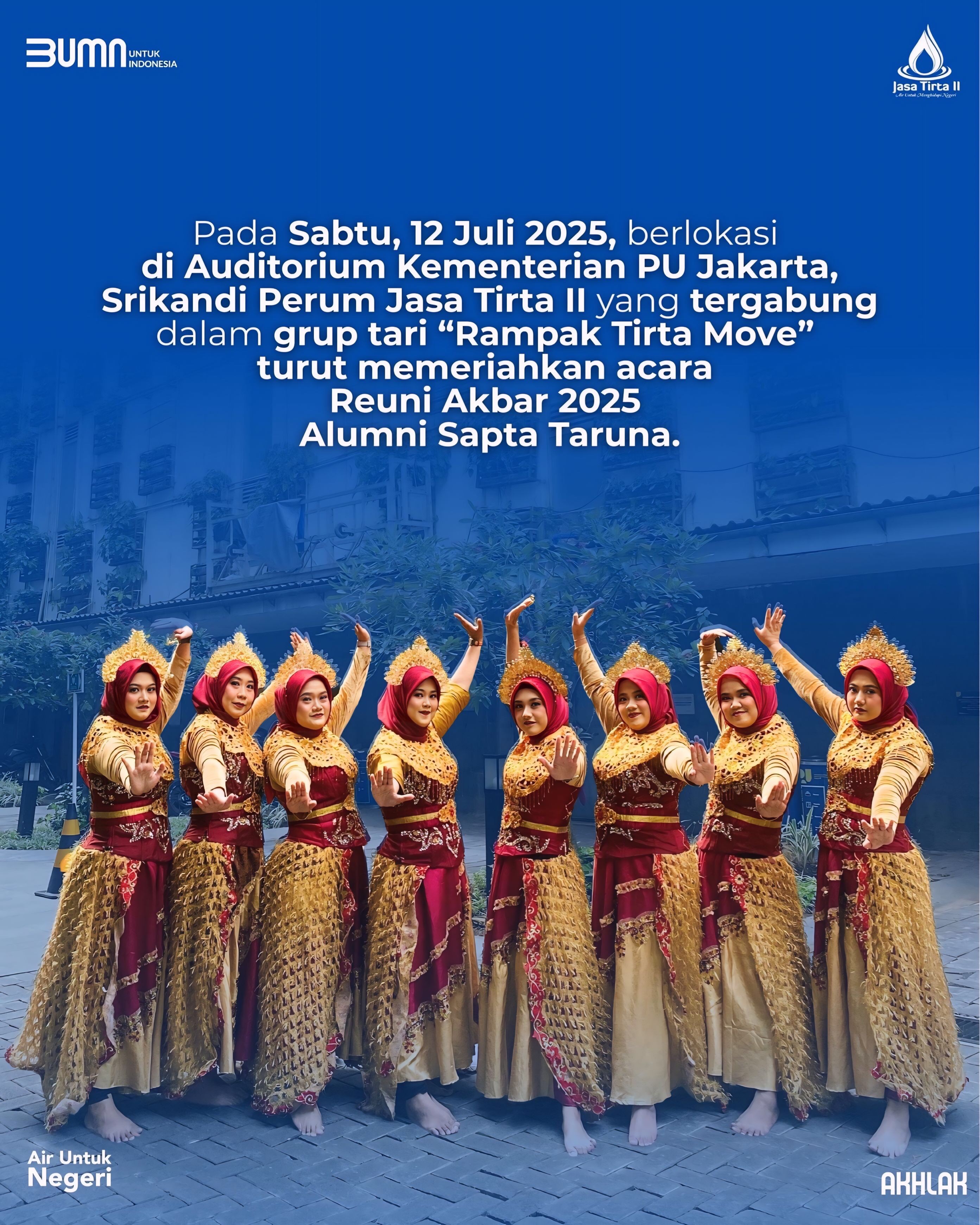 Pada Sabtu, 12 Juli 2025, berlokasi di Auditorium Kementerian PUPR Jakarta, Srikandi Perum Jasa Tirta II yang tergabung dalam grup tari Rampak Tirta Move” turut memeriahkan acara Reuni Akbar 2025 Alumni Sapta Taruna.