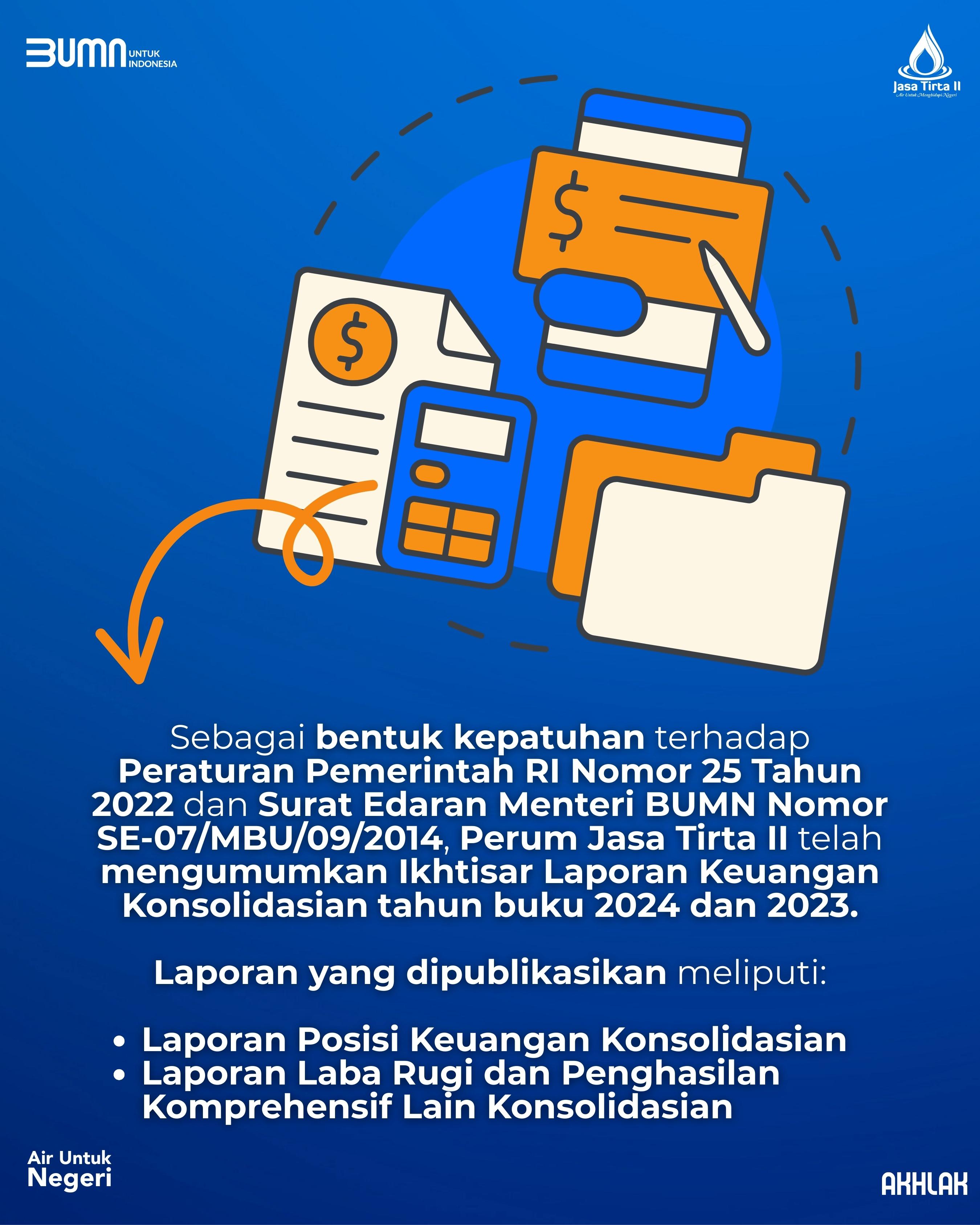 Sebagai bentuk kepatuhan terhadap Peraturan Pemerintah RI Nomor 25 Tahun 2022 dan Surat Edaran Menteri BUMN Nomor SE-07/MBU/09/2014, Perum Jasa Tirta II telah mengumumkan Ikhtisar Laporan Keuangan Konsolidasian tahun buku 2024 dan 2023.